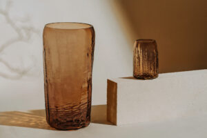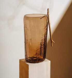 Obiekty mają formę naczyń – swobodne, rzeźbiarskie struktury barwione w masie oddają zmienność i siłę naturalnych żywiołów. W limitowanej serii projektantka wykorzystuje plastyczność gorącego szkła, tworząc unikatowe egzemplarze, zróżnicowane pod względem grubości i intensywności faktury wyplatanej ręcznie z wikliny. Każdy obiekt opatrzony jest grawerowaną sygnaturą i numerem edycji.