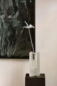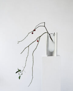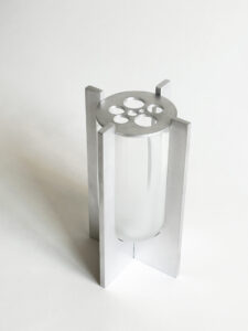 Wazon „Zefir” powstał po to, aby cieszyć się pięknem kwiatów. W swojej minimalistycznej formie jest ich idealnym dopełnieniem. Główny element wykonany jest z grubego, ręcznie formowanego szkła. Dzięki zastosowaniu gradientu piaskowania na jego zewnętrznej powierzchni, wazon wygląda, jakby był zamrożony. Szklany cylinder został umieszczony w aluminiowym, ręcznie szczotkowanym stelażu. Obiekt dopełnia ikebana – dodatkowa aluminiowa nakładka z otworami o różnej średnicy, dzięki której możesz w łatwy sposób ułożyć własną kompozycję kwiatową. Zefir wiosną budził do życia przyrodę, a upalnym latem przynosił orzeźwiające ochłodzenie.