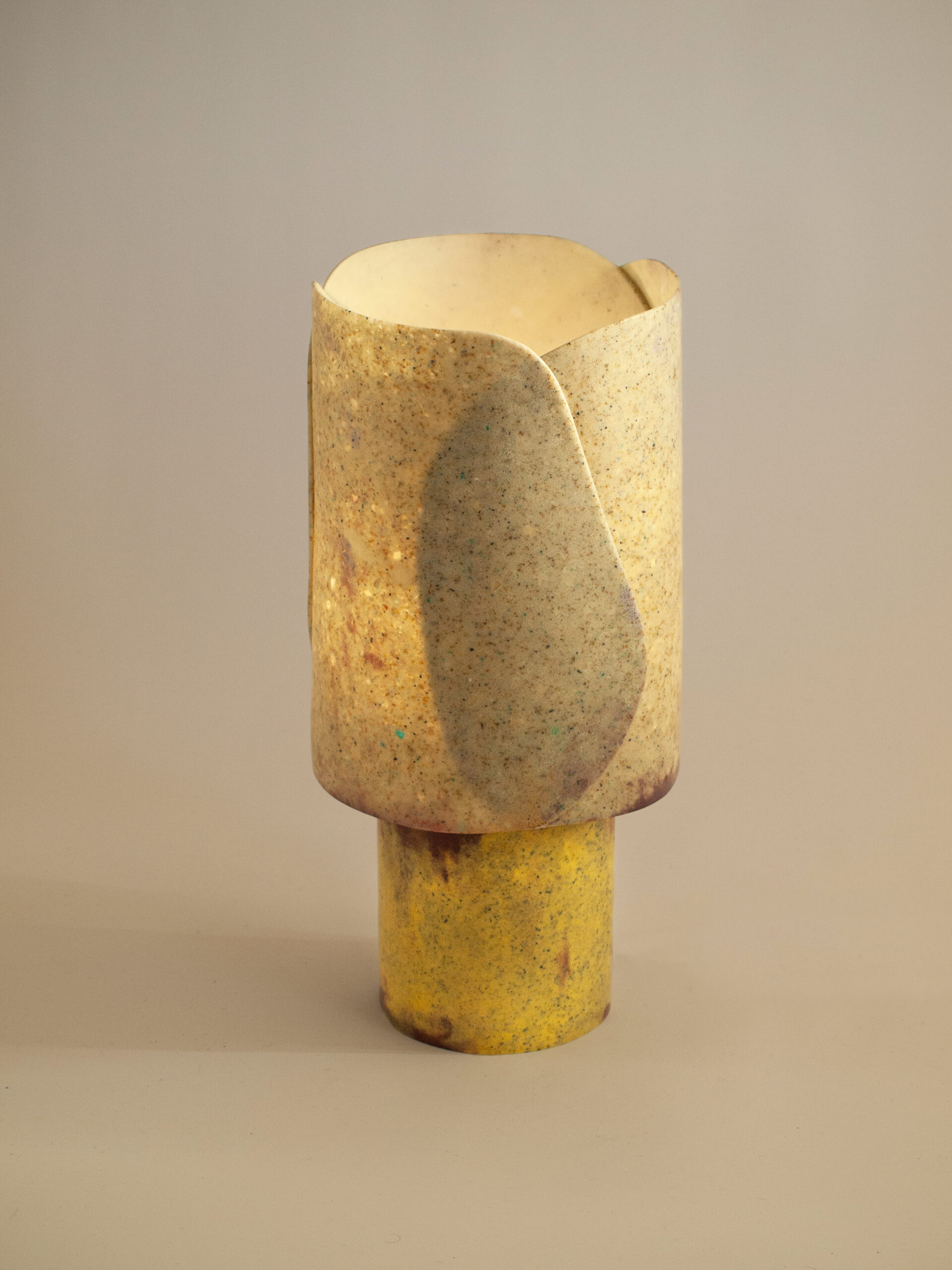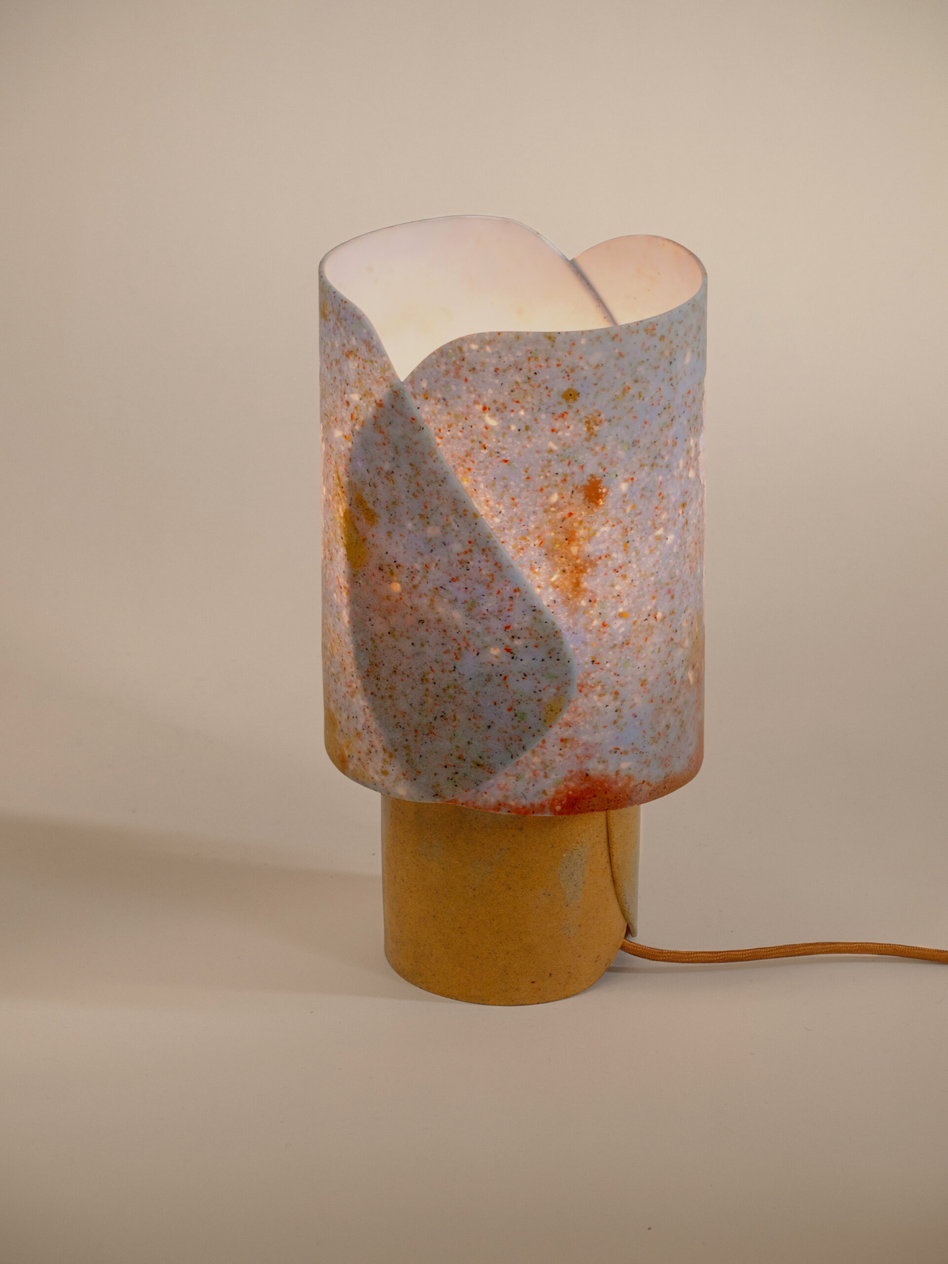 Dzięki swojej malarskiej powierzchni i subtelnej formie lampa stołowa „Verve” emanuje poetyckim nastrojem światła i koloru. Zainspirowana organicznymi formami natury oraz paletą barw malarzy postimpresjonistycznych, sama w sobie stanowi dzieło sztuki dekoracyjnej. Wykonana w całości z materiału składającego się z kolorowych cząstek szkła z recyklingu oraz barwionej, biopochodnej żywicy, lampa ukazuje wyjątkowe spektrum przezroczystości. Światło lampy odsłania kontury formy, przekształcając klosz z nieprzejrzystego i gęstego – gdy lampa jest wyłączona – w migoczący i lekki, gdy zostaje włączona. Głębokie, nasycone barwy oraz miękkie, rozproszone światło tworzą atmosferę ciepłej zmysłowości we wnętrzu. Kształt lampy łączy nowoczesną prostotę z sensualnymi liniami oplatających się, liściopodobnych powierzchni, a techniczny element w postaci przewodu staje się subtelnie podniesionym, integralnym składnikiem projektu. Duża lampa stołowa Verve Justyny Popławskiej - justyna-poplawska-duza-lampa-stolowa-verve