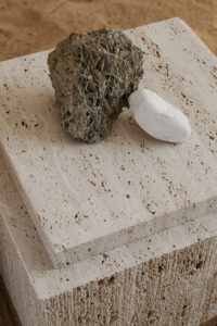 Meble z serii LINEE dostępne są w dwóch wariantach materiałowych: wyjątkowego prążkowanego trawertynu lub eleganckiego kwarcytu Taj Mahal o satynowym wykończeniu. Te starannie wyselekcjonowane kamienie zapewniają trwałość i zachwycają unikalną strukturą.