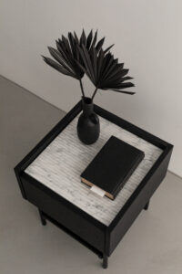 FORST Night stand to elegancki i funkcjonalny stolik nocny z marmurowym blatem. Wygodną szufladą otwieraną systemem TIP ON i dodatkowa półka umożliwiają wygodne przechowywanie rzeczy, które zawsze powinny być pod ręką. Góra stolika wykończona jest pięknym kamiennym blatem, który można zamówić w jednym z 3 wariantów: